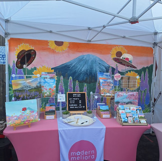 Arriving at the market early at 7 AM, I was filled with anticipation. Setting up the tent and unveiling the mural was a thrilling moment. The mural is a burst of color and intricate designs that represent the essence of Modern Meliora – blending nature, whimsy, and a touch of the Pacific Northwest charm.